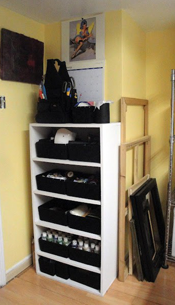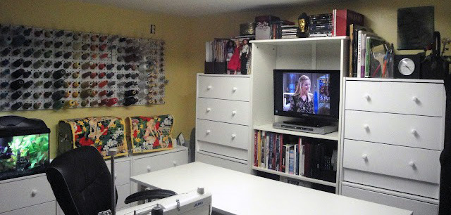 Well come on in and let me show you around! The bookshelf contains my quilting books and art books, and the stacked dressers on either side contain:
