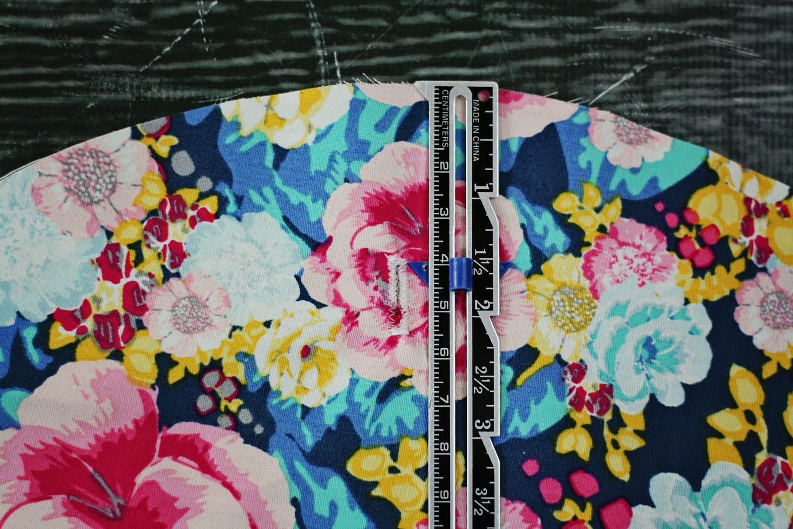 Step 6: Center the smaller circle on the larger circle with the inside of the larger circle facing the inside of the smaller circle. Pin in place. Transfer the lines from the pattern piece to the outside of the smaller circle using a fabric marker or chalk that can easily be removed as shown below. These lines will include the 3" circle as well as the lines used to create the pockets.