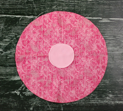 Step 2: Choose which one of the smaller circles will be the inside of the pockets (this fabric is the least seen). Find the center of the circle and baste on the 3" fleece circle. This circle serves as an extra padding and adds a little structure to the bottom of the pouch.