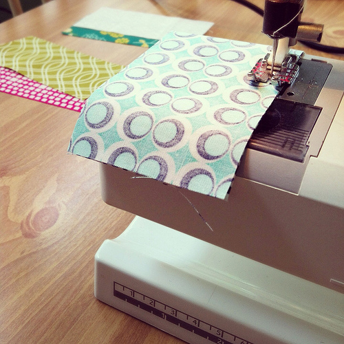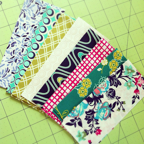 Working in pairs, piece your strips along the long sides using 1/4" seam allowance.