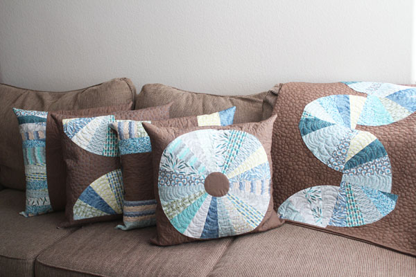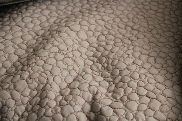 The finished pieces are wonderful. I love the way the cool palette of the fabrics has been offset by the earthly brown. I get a feeling of calming and nurturing hospitality. Accentuating these qualities are stunning little pebbles craftfully quilted all over the negative space.