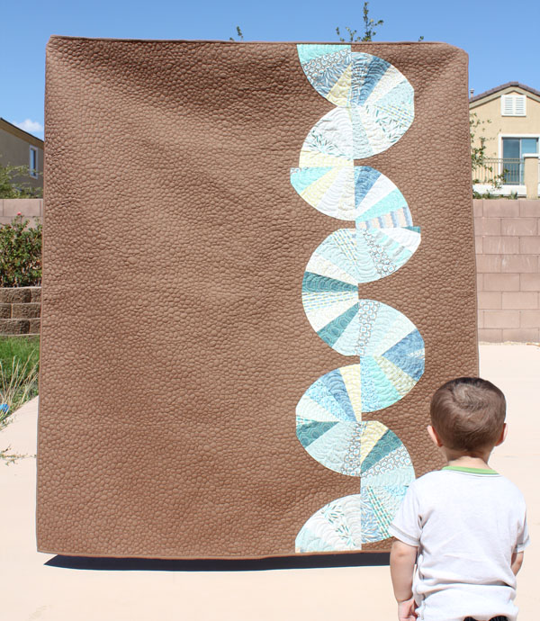 We let Carolina have a go with our soon to be released fabric collection, Legacy, and she certainly did the fabric justice. More importantly, she made it her own with the pairing of a neutral "handmade" brown as her solid and a very unique twist on the Dresden block that runs vertically and off-center down one side of the quilt.