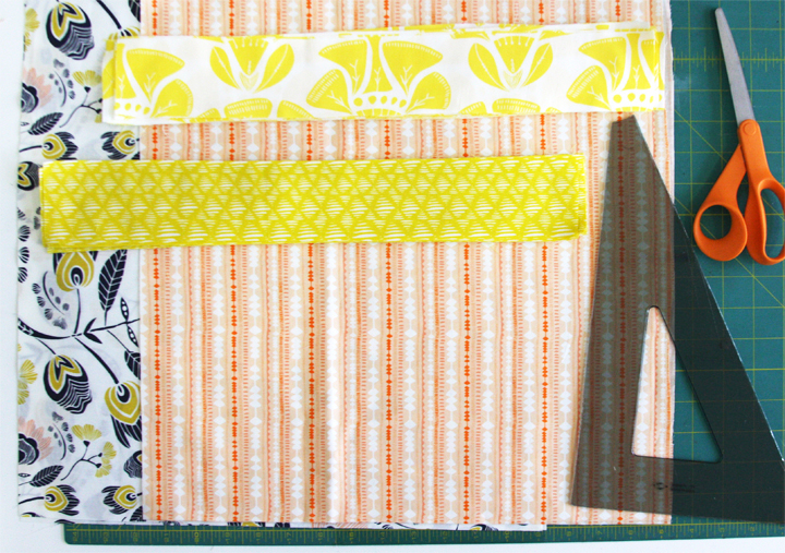 striped pieces on top with print side facing up. Fold over your backing fabric