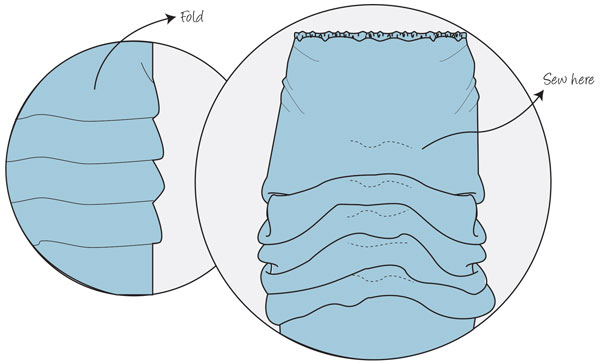 create the second pleat. Continue measuring 3” and 6” down to create the other pleats. You can make as many as you want. We ended up with four pleats. Pin and press each pleat in place. Sew the pleats horizontally 6” and you are done.