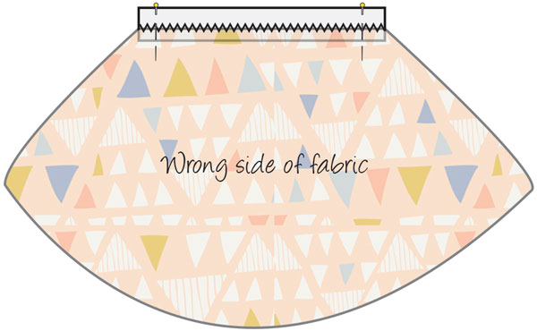 Pin the elastic to the center (front and back) of the skirt's waist then continue pinning the elastic all the way around the outside of the skirt halfway up on the elastic's width. When you are done pinning start sewing with a close and wide zig-zag stitch to attach them together (stretch the elastic JUST A LITTLE BIT while you are sewing).