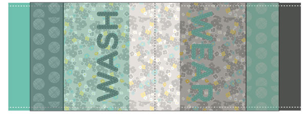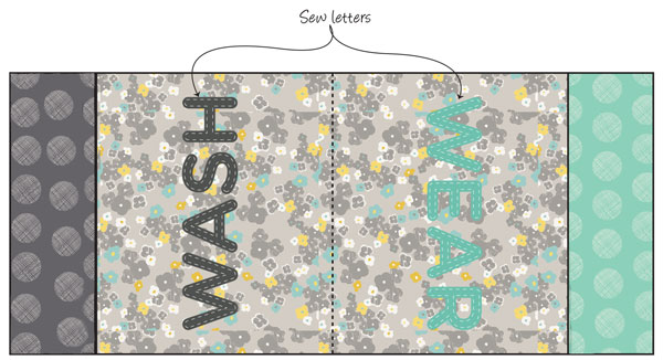 Take piece 8 and lightly iron just one side of the double stick fusible on it, now using the template as guide cut out the word WASH and repeat the same steps with piece 9 cutting out the word WEAR.