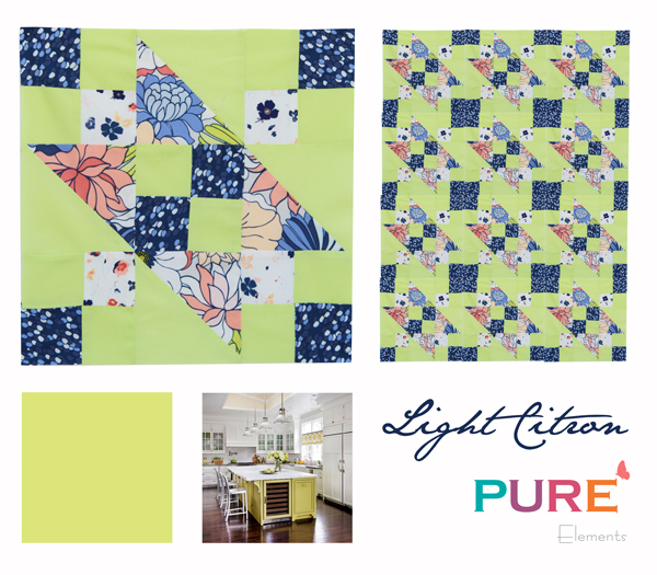 Notice how with Light Citron the Chic Flora prints jump out, and the darkest one (Innocent Charm Acai) sets the pattern for the eye. Choosing this combination also creates a very fresh and citrus quilt adequate for light breeze summer days.