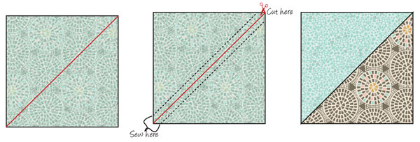 Pair the 5 7/8" squares taking one from each fabric. Place one on top of the other face-to-face and using an erasable fabric market trace a diagonal line on the top square. Sew ¼” away from the line on both sides of it. Cut through the line previously traced. You should have two separate pieced squares. Press seams open and repeat the same steps with all the remaining pairs of squares.