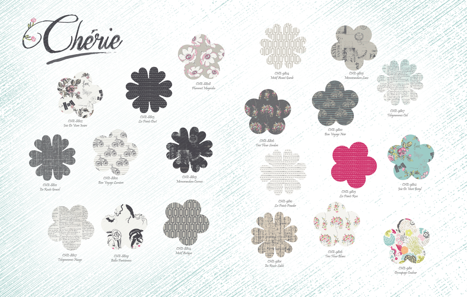 Chérie's color palette illustrates a very feminine romantic feel and is a low volume collection, which means it consists of mid tone values (low contrast, white background, light colors). Because of this, the collection is very versatile, it can be both masculine and feminine.