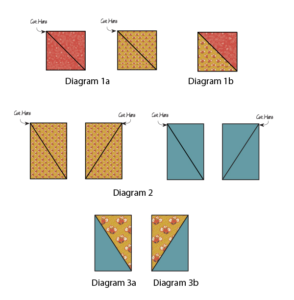 Cut all 2 7/8” x 2 7/8” squares from Fabric A and C diagonally in half. (Diagram1a)