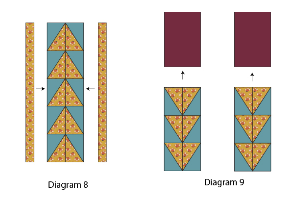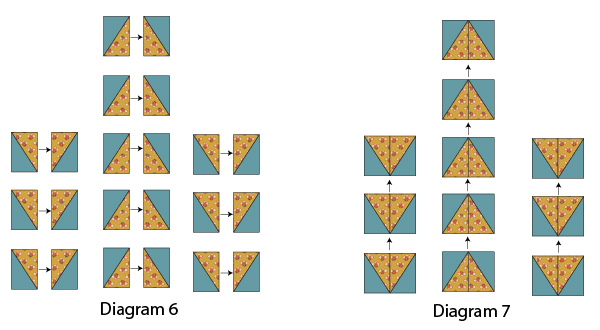 Next take 22 half rectangle triangles and place them following Diagram 6. Sew right sides together and press open. Following Diagram 7 sew the pieces you made in Diagram 6 together.