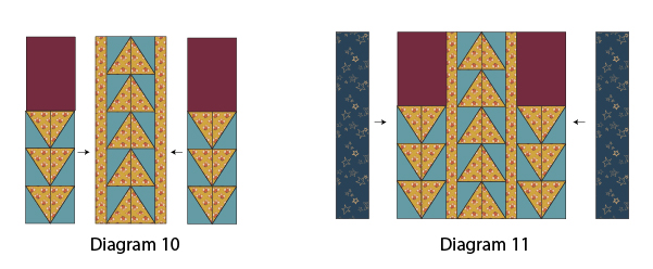Take pieces created in Diagram 8 and 9 and arrange them following Diagram 10. Sew right sides together and press seams open. Now take 2 1/2” x 10 1/2” strip from Fabric B and sew to the outsides of the piece you created in Diagram 10. (Diagram 11)