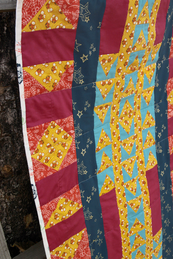 Machine or hand quilt starting at the center and working towards the corners. Remember that quilting motifs are a matter of personal preference. Have fun choosing yours! After you finish, trim excess of any fabric batting, squaring the quilt to proceed to bind it.