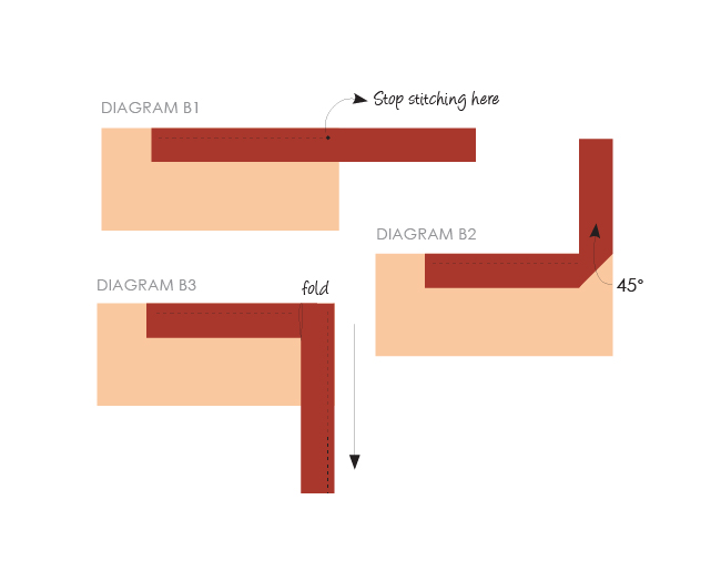 Stop stitching ¼” before the edge of the quilt (Diagram B1). Clip the threads. Remove the quilt from under the machine presser foot. Fold the strip in a motion of 45 degrees and upward, pressing with your fingers. (Diagram B2) Hold this fold with your finger; bring the strip down in line with the next edge, making a horizontal fold that aligns with the top edge of the quilt (Diagram B3). Start sewing at ½” of the border, stitching all the layers. Do the same in the four corners of the quilt.