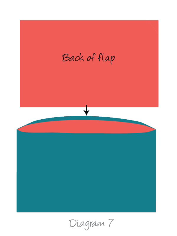 Flip both lining and exterior of the clutch with right sides out. Turn under raw edges on both pieces at 1/4” and press. Tuck the lining into the exterior of your clutch. Sandwich the flap between the lining and the exterior, pin pieces together and top stitch all the way around the clutch as close to the edge as possible. (Diagram 7)