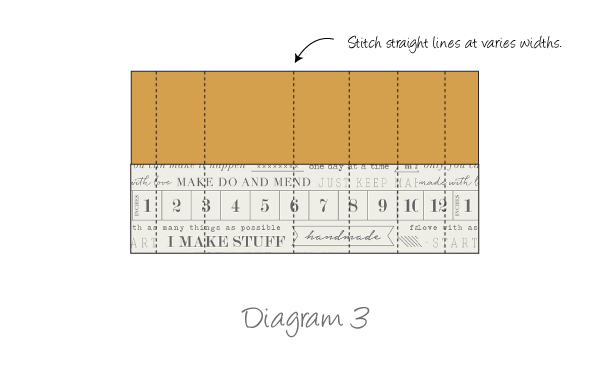 Press seam and lay on top of a 5 1/2” x 10 1/2” rectangle from Fabric E. Stitch straight lines at varies widths through the entire piece. (Diagram 3)