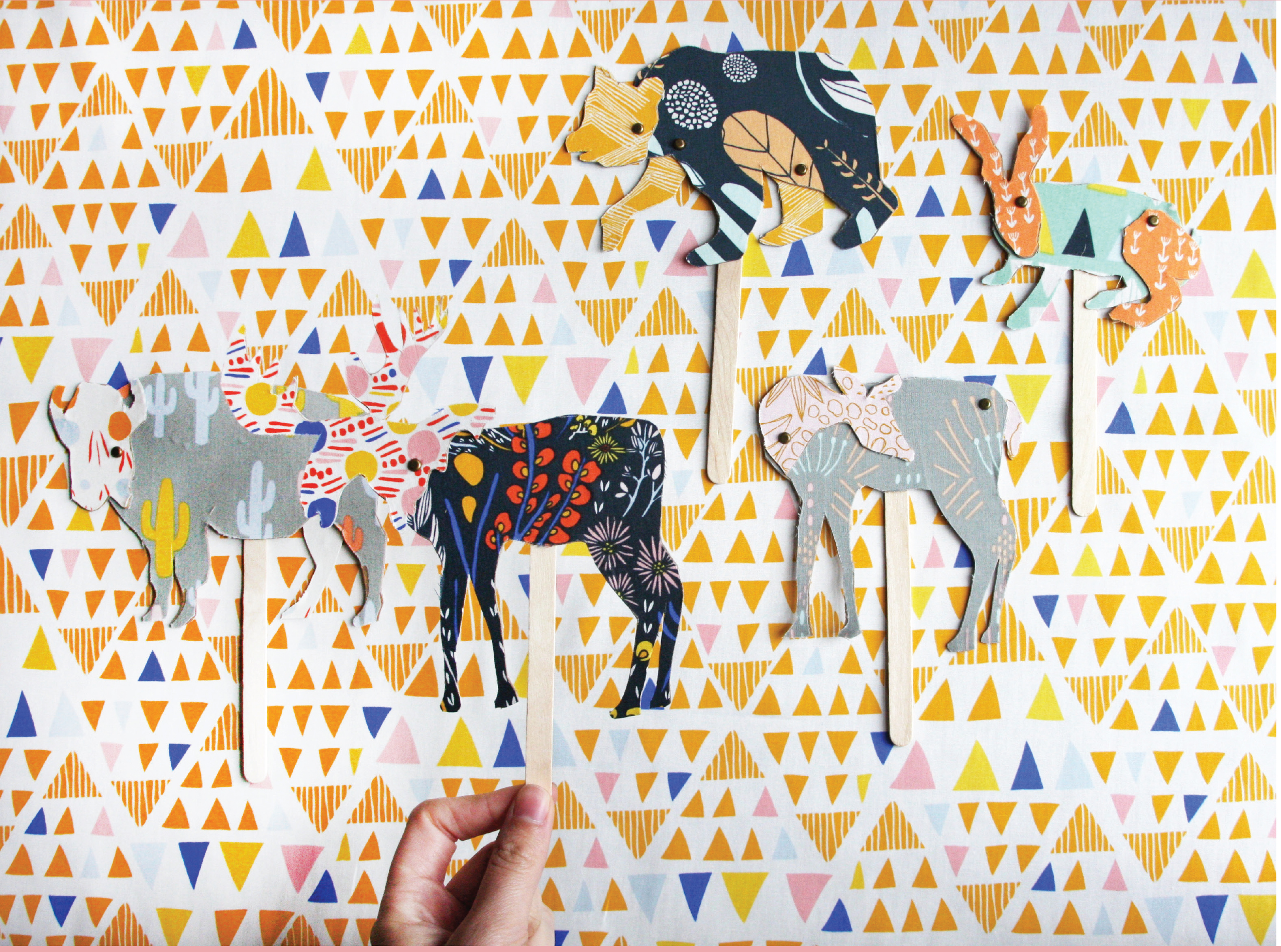 3. Lay out your fabric and animal templates and group the template with the fabric on a piece of card stock for each animal.