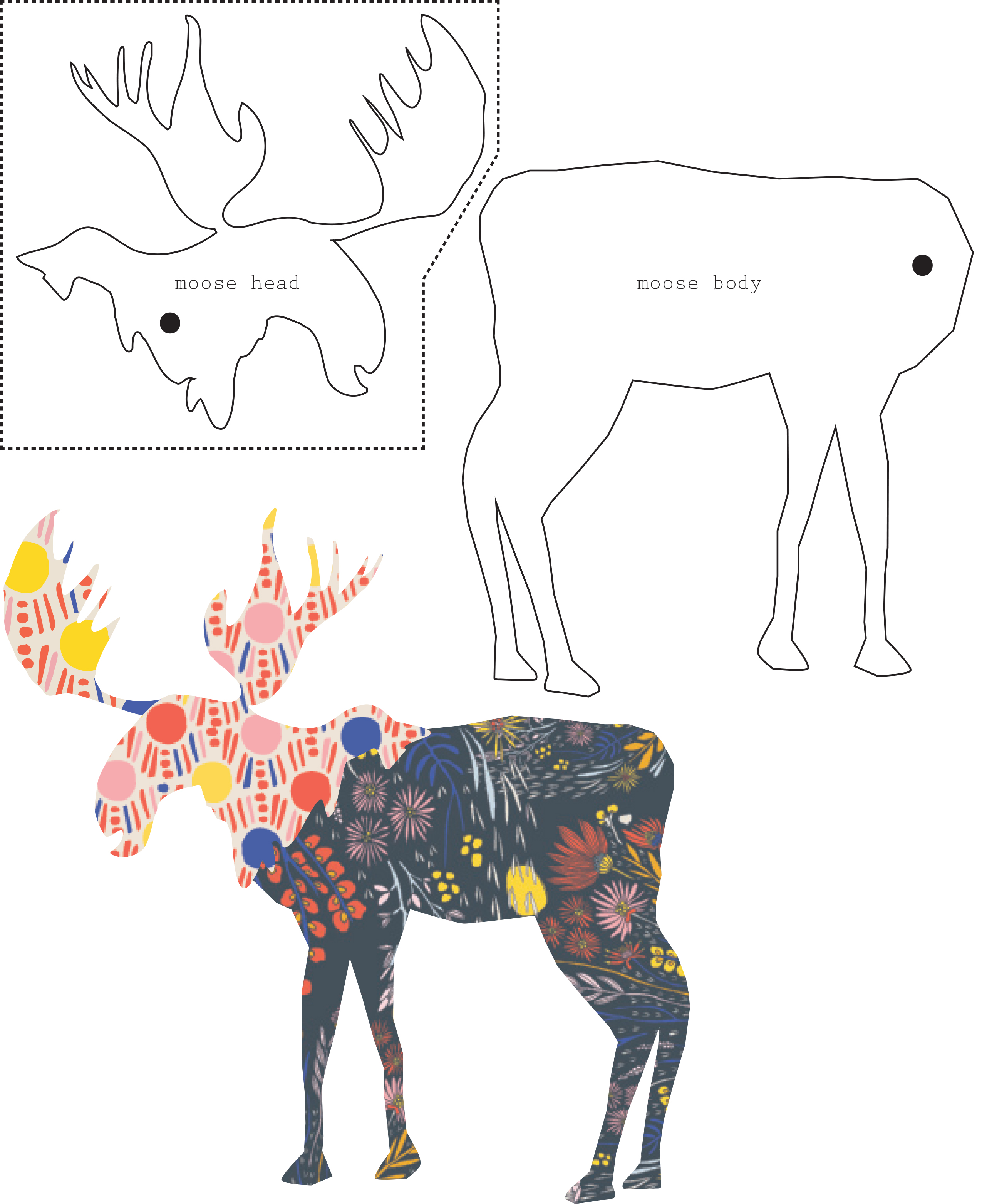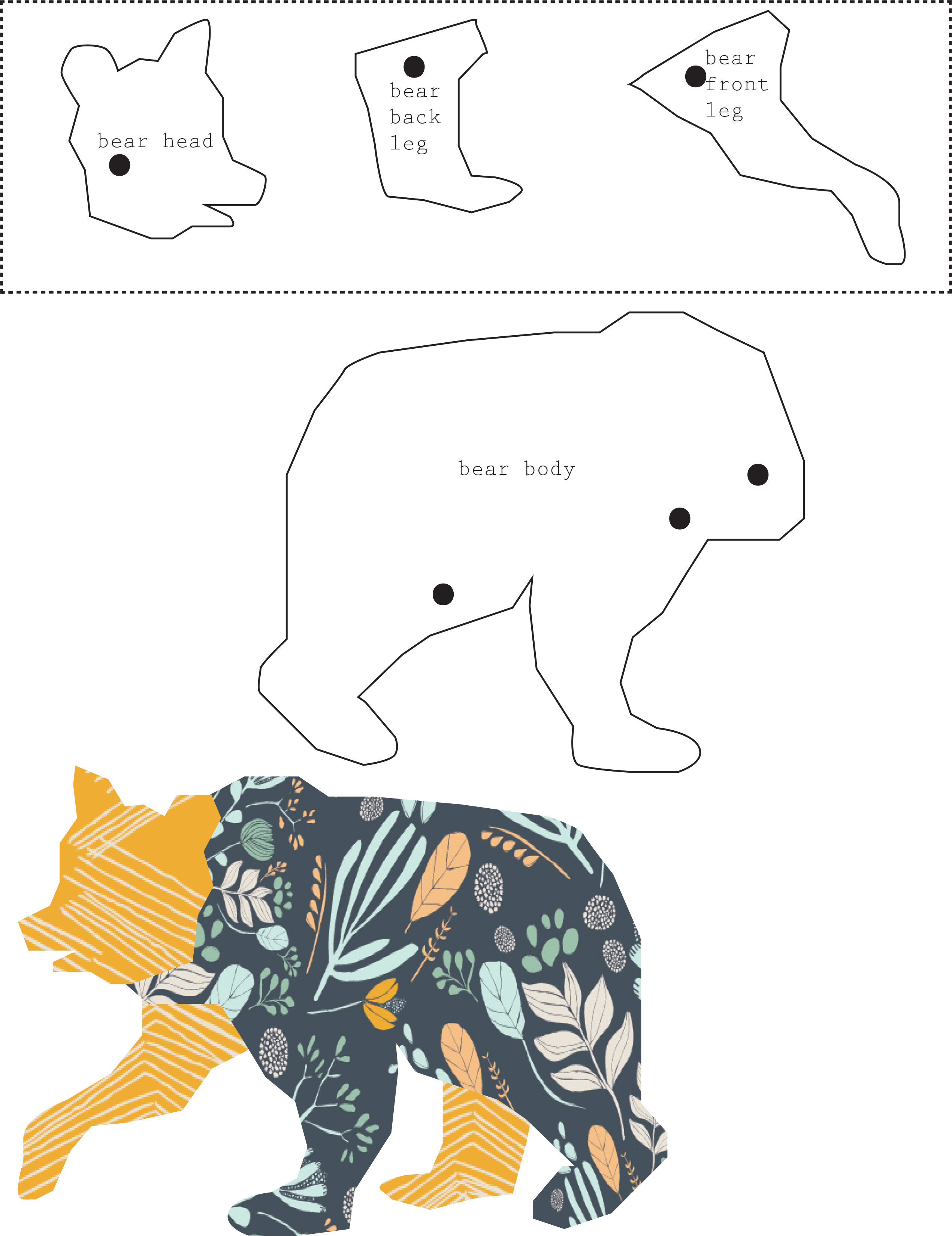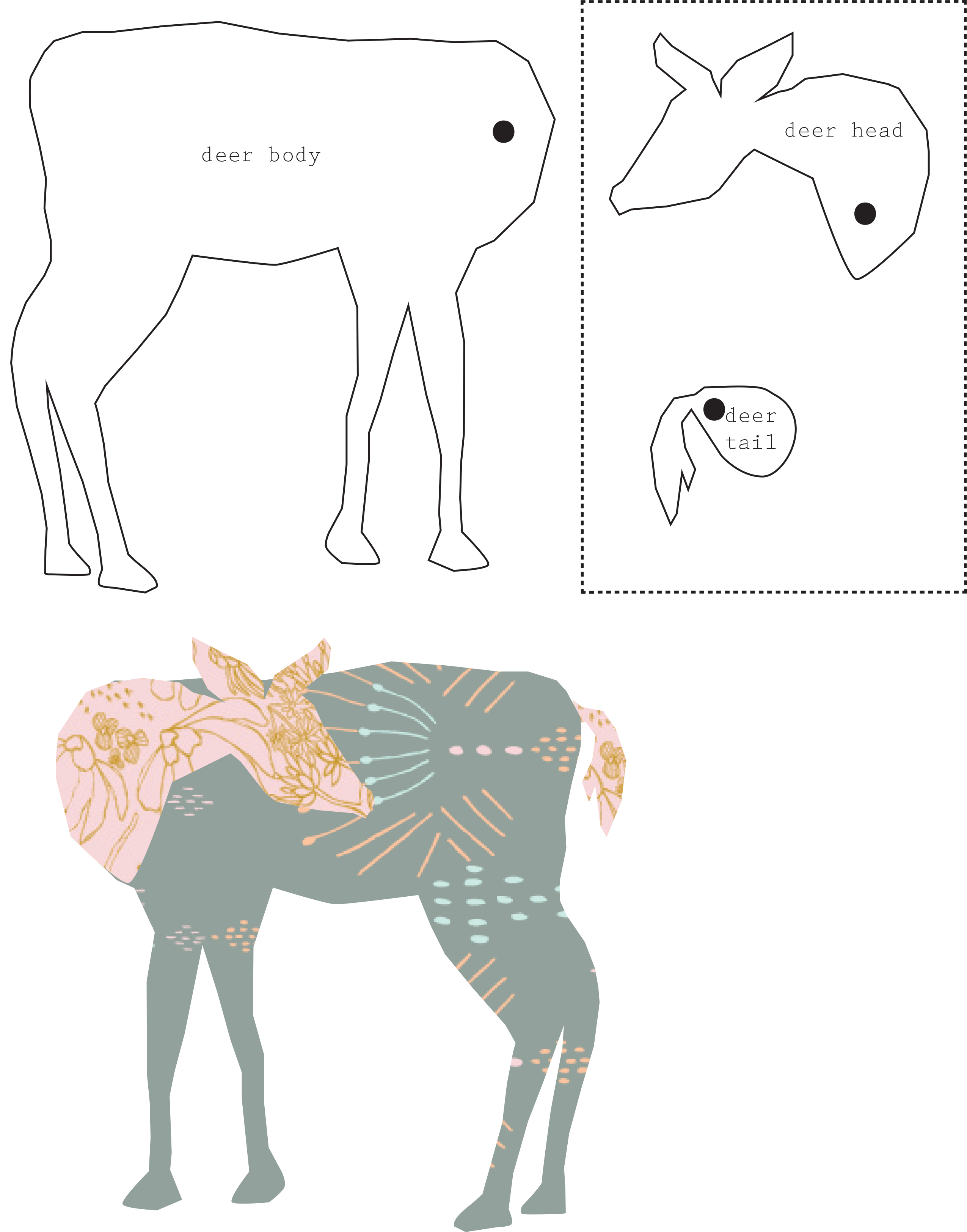 4. Cut the template so that the body is separate from the legs and head and pair the part with the corresponding fabric. The image of the completed animal is for your reference throughout the tutorial.