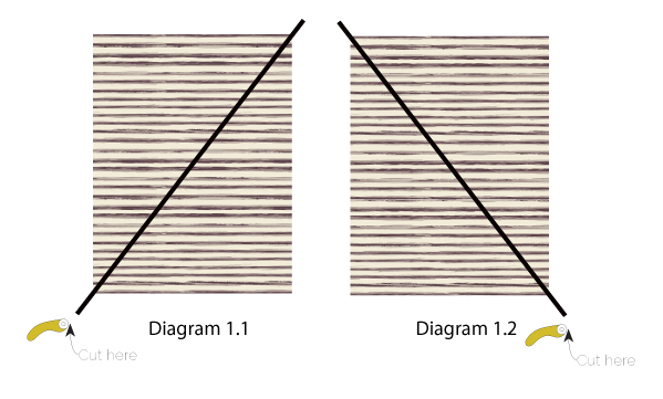 Take two 6 1/2” x 8 1/2” rectangles and cut from the left bottom corner diagonally to the right top corner.Cut the the other rectangle starting from the right bottom corner cutting diagonally to the top left corner. Follow Diagram 1.1 and 1.2.