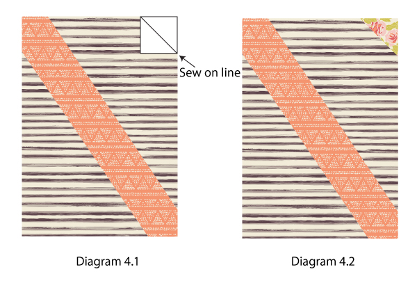 Take two 2” x 2” squares from Fabric A and draw a diagonal line from one corner to the other on the back side of the fabric. Place it right sides together to the right top corner of of the piece you made in Diagram 3.1. Sew on the diagonal line. Press piece and cut the seam allowance to 1/4”. Repeat same process with the other 2” x 2” square from Fabric A and the piece made in Diagram 3.2. This time place piece on the left top corner right sides together.