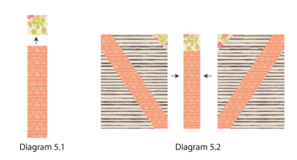Sew a 2” x 7 1/2” strip from Fabric B to a 2” x 2” square from Fabric A. (Diagram 5.1) Next sew this piece in between both pieces created in Diagram 4.1-4.2. Follow Diagram 5.2