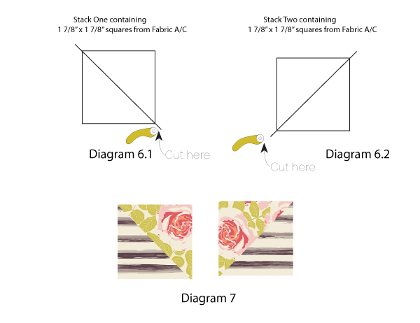 Now you will need to make two HST’s with Fabric A and C. Since Fabric C is a directional print and for this pillow the direction is horizontal, you need to make two stacks each with one 1 7/8” x 1 7/8” square from Fabric A and C on top of each other with right sides facing up. Cut one stack from the bottom right corner to the left top corner. Cut the other stack from the bottom left corner to the top right corner. (Diagram 6.1 and 6.2)