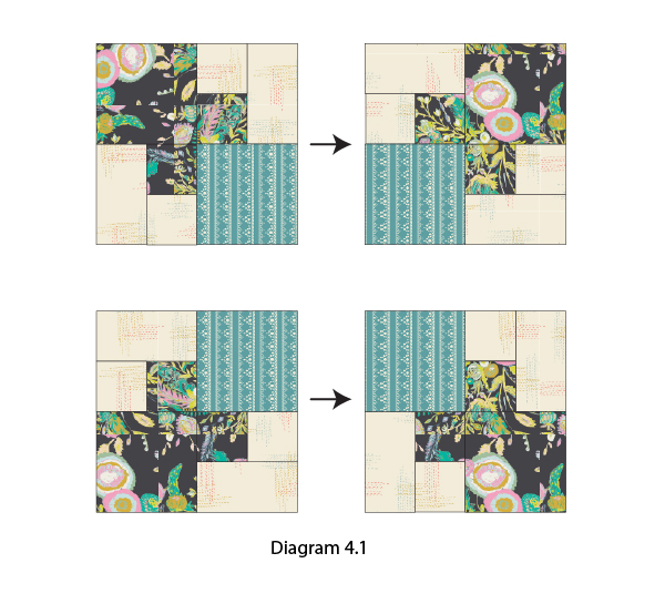 Step 3: Make another block like Diagram 3. Then make two more mirrored blocks. Place four blocks out following Diagram 4.1. Sew blocks together. (Diagram 4.1 and 4.2) You should get a finished block that looks like Diagram 5. Repeat this process with the remaining fabric pieces to get two more blocks. Sew the three blocks together following the table runner illustration as a guide.