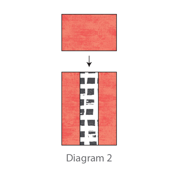 Sew two 1 1/2” x 3 1/2” strips from Fabric B to each side of a 1 1/2” x 3 1/2” strip from Fabric A. (Diagram 1)