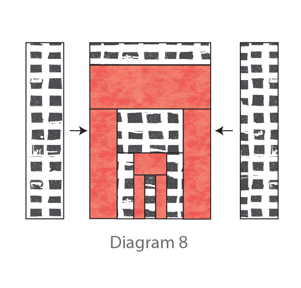Sew two 3 1/2” X 14 1/2” strips from Fabric A to each side of the piece created in Diagram 7. (Diagram 8)
