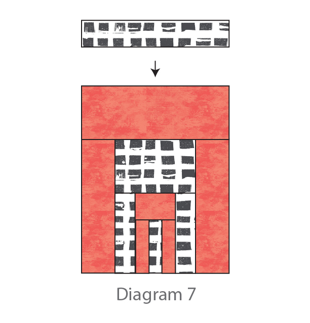Sew a 4” x 9 1/2” strip from Fabric B to the top of the piece created in Diagram 5. (Diagram 6)
