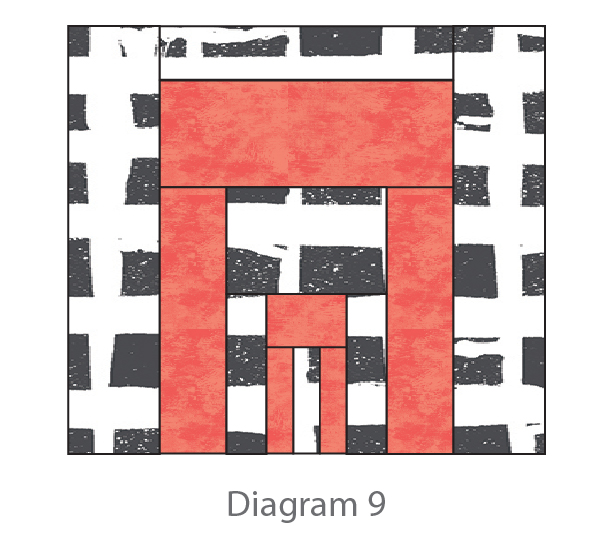 You should now have a piece that looks like Diagram 9. Repeat the same process in Diagram 1 -8 with the remaining fabric pieces to create three more pieces that look like Diagram 9. Sew pieces together following table runner illustration as a guide.