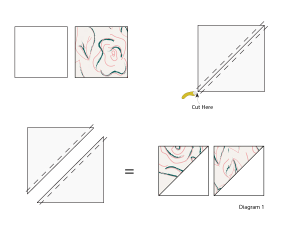 - Stop stitching ¼” before the edge of the quilt (Diagram B1). Clip the threads. Remove the quilt from under the machine presser foot. Fold the strip in a motion of 45 degrees and upward, pressing with your fingers. (Diagram B2) Hold this fold with your finger; bring the strip down in line with the next edge, making a horizontal fold that aligns with the top edge of the quilt (Diagram B3). Start sewing at ½” of the border, stitching all the layers. Do the same in the four corners of the quilt.
