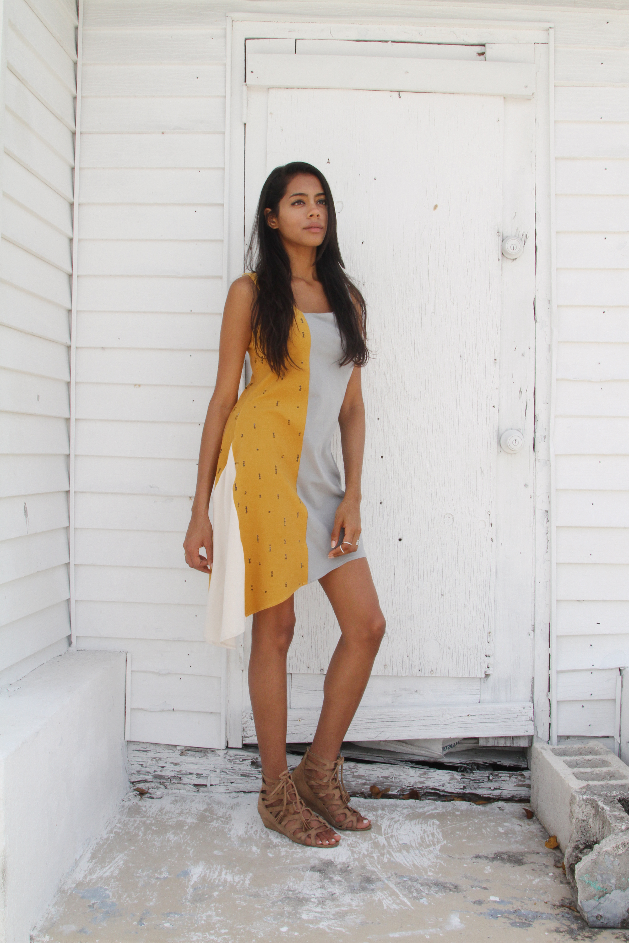 I am a fan of asymmetry in fashion! This dress features an asymmetrical neckline and hemline. I love how the dotted mustard fabric from the Imprint collection by Katarina Roccella creates gives grey and white solids a contrasting look!