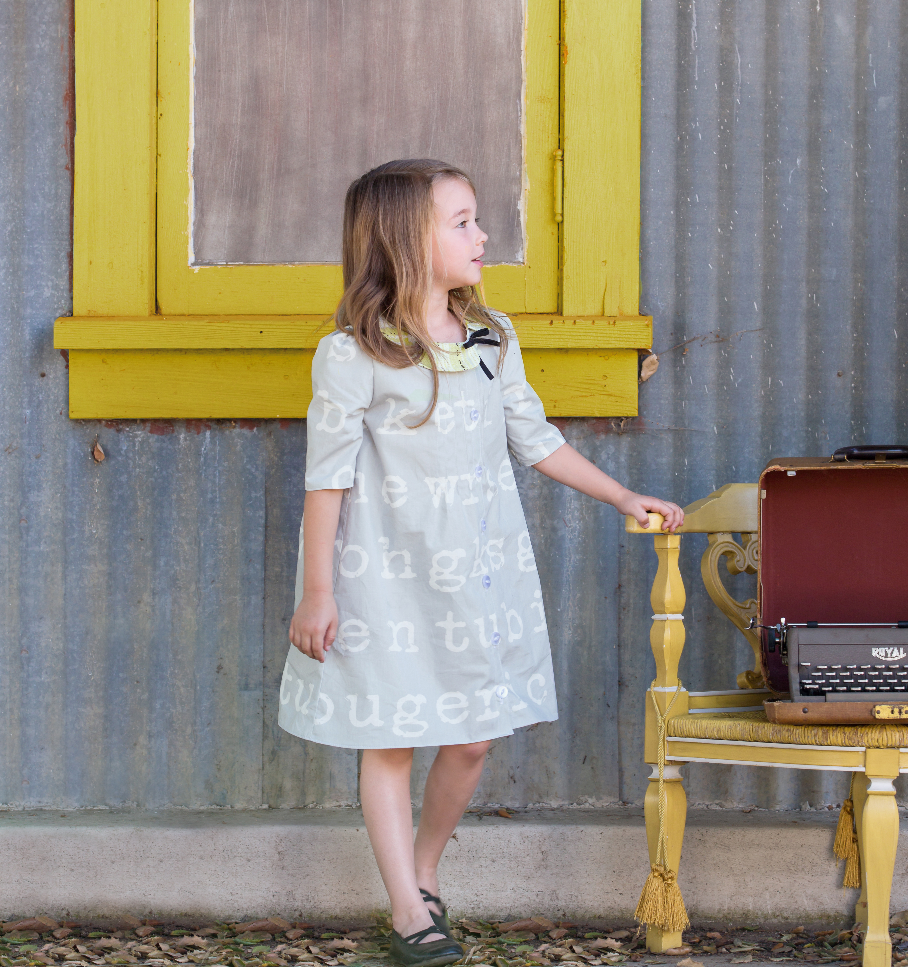 What I especially like about this dress is the little collar made with contrasting vivid yellow fabric. Also, there is something about this lettered grey fabric print that makes it so modern and classy! Oh.. and the pattern offers three sleeve lengths! Isn't that cool?