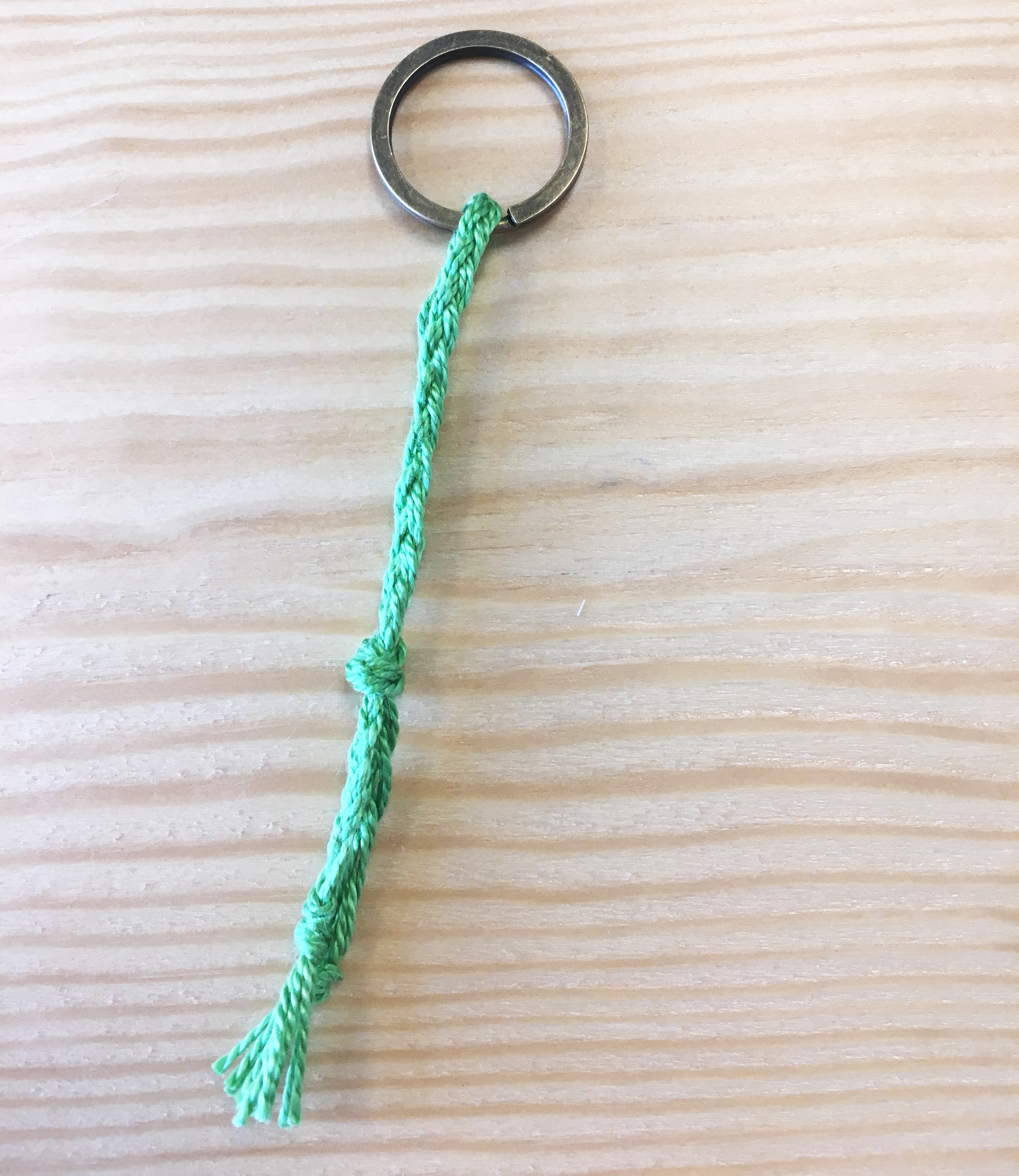 2- Mine was a little long so I cut it where you see the knot in the middle. After your braid, loop it through the key ring.