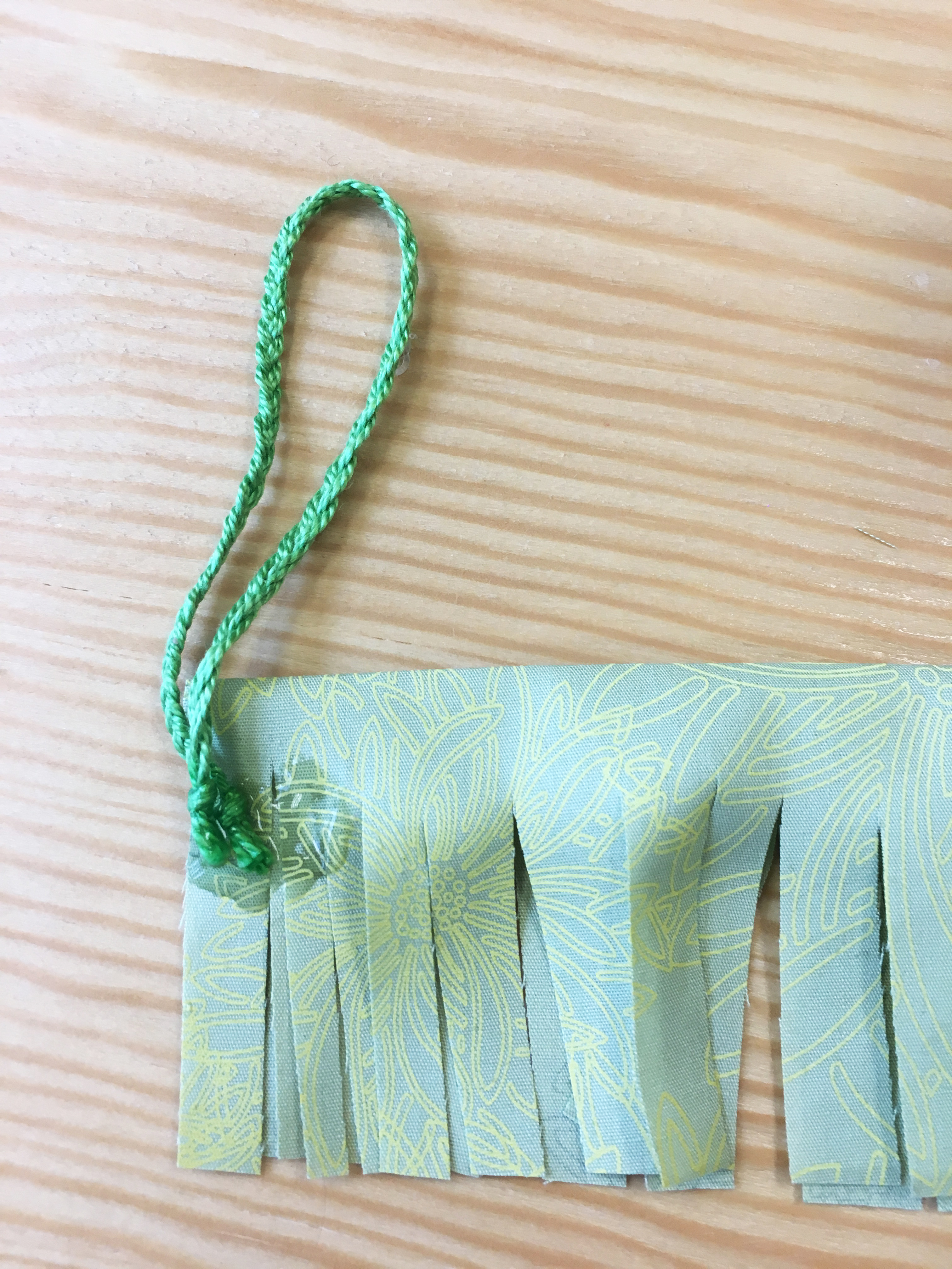 4- After cutting all the fringes put some hot glue on the top of your fabric strip and press the braid to the fabric.
