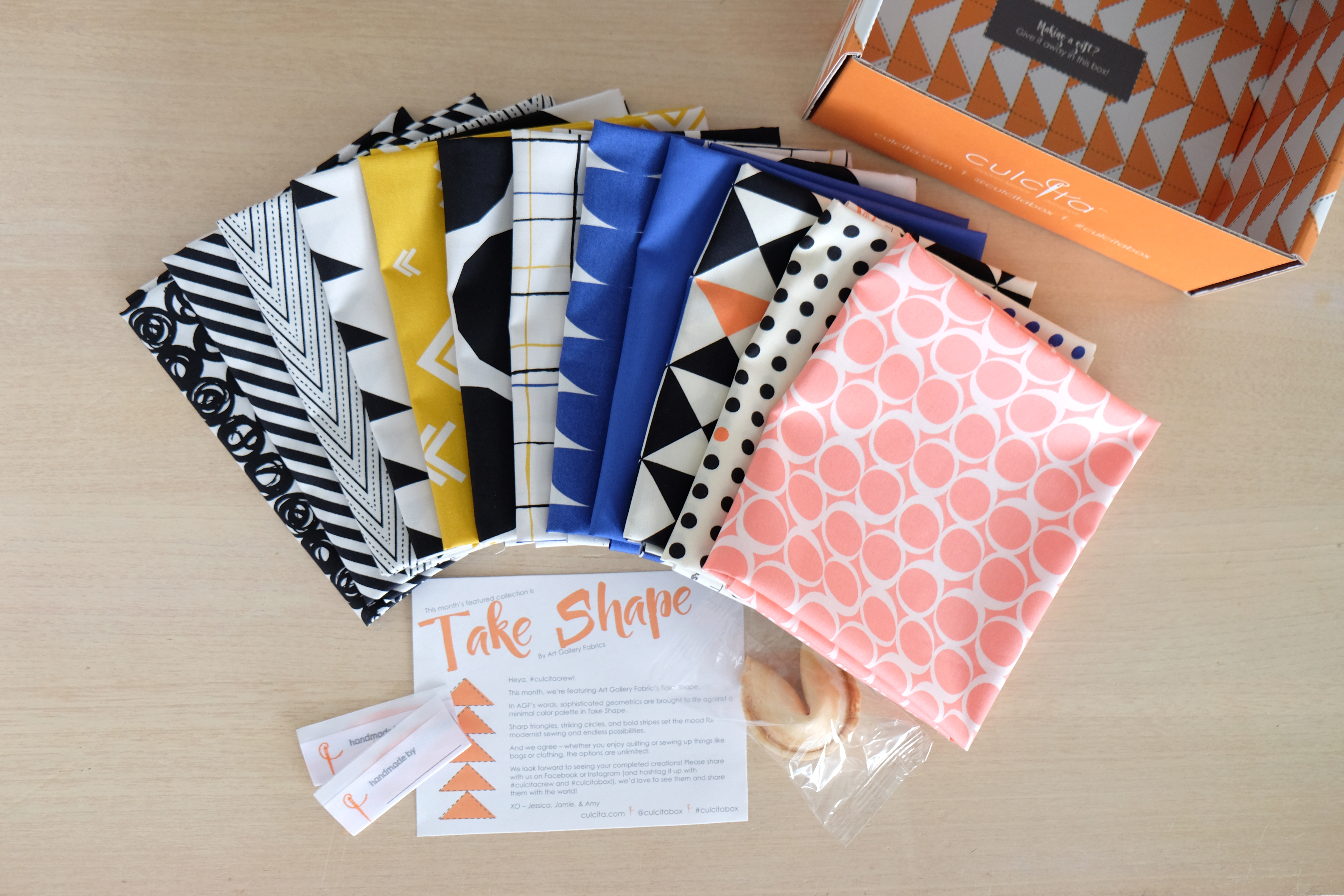 If you love receiving happy mail with your favorite modern fabrics, there’s a new subscription service you’ll love! Fabric lovers, meet Culcita (kul-see-tah, the Latin origin of the word "quilt")! This fabric subscription focuses on modern fabric bundles featuring 12 prints from a full collection along with two crafty write-in-your-name fabric labels, and a yummy fortune cookie with a quilty message.