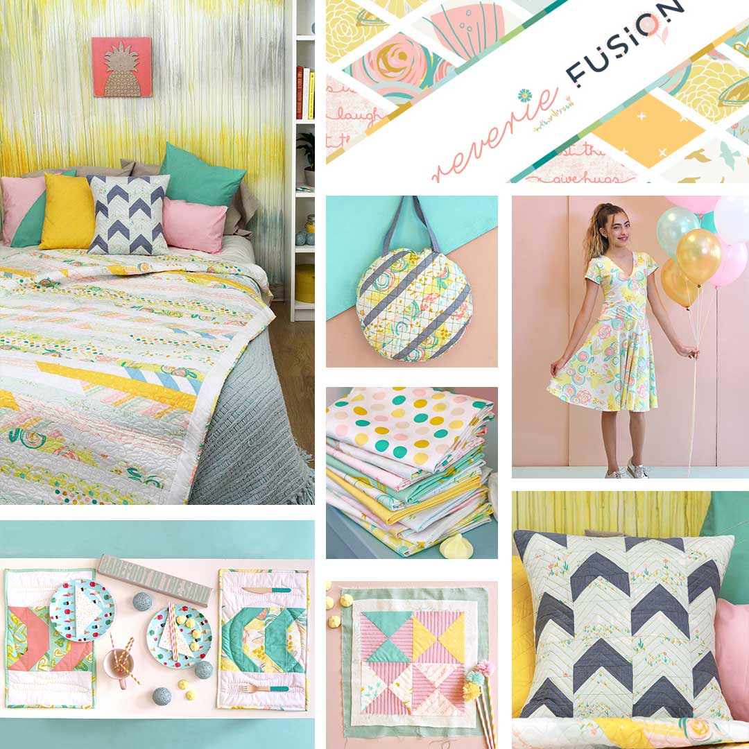 If you’re looking for dreamy fabric for a girl’s nursery or you’re thinking of making sweet dresses, you’re going to love Reverie Fusions. Delicate blooms are combined with playful shapes and words topped off by soft shades of tangerine, turquoise, and pink.