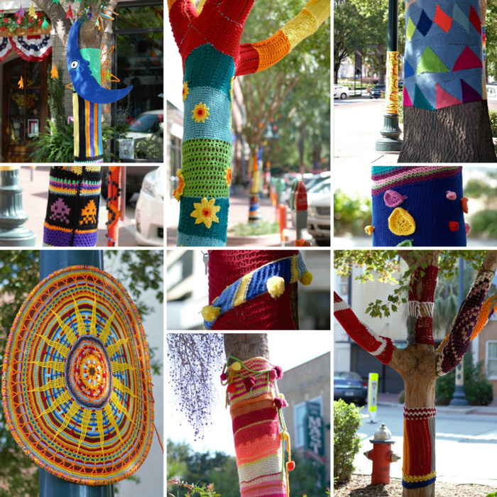 We stopped for a late lunch in Columbia, SC and took a stroll around the downtown area to find to our delight that it had been “yarn-bombed.” It seems the industrious crocheters and knitters of Columbia have adopted a stretch of the downtown and nothing is safe from their needles. Trees, benches, traffic signs and parking meters are all decorated in multicolored custom knit outfits. That afternoon in the beautiful sun and light breeze, surrounded by the product of such industrious creativity it was truly possible to believe that everything was going to be alright. When we sew and quilt, we put a little of ourselves into each piece. “Made with Love” is not just a cute label, but the truth, and that day I could feel the joy and love that each person had put into their street art.