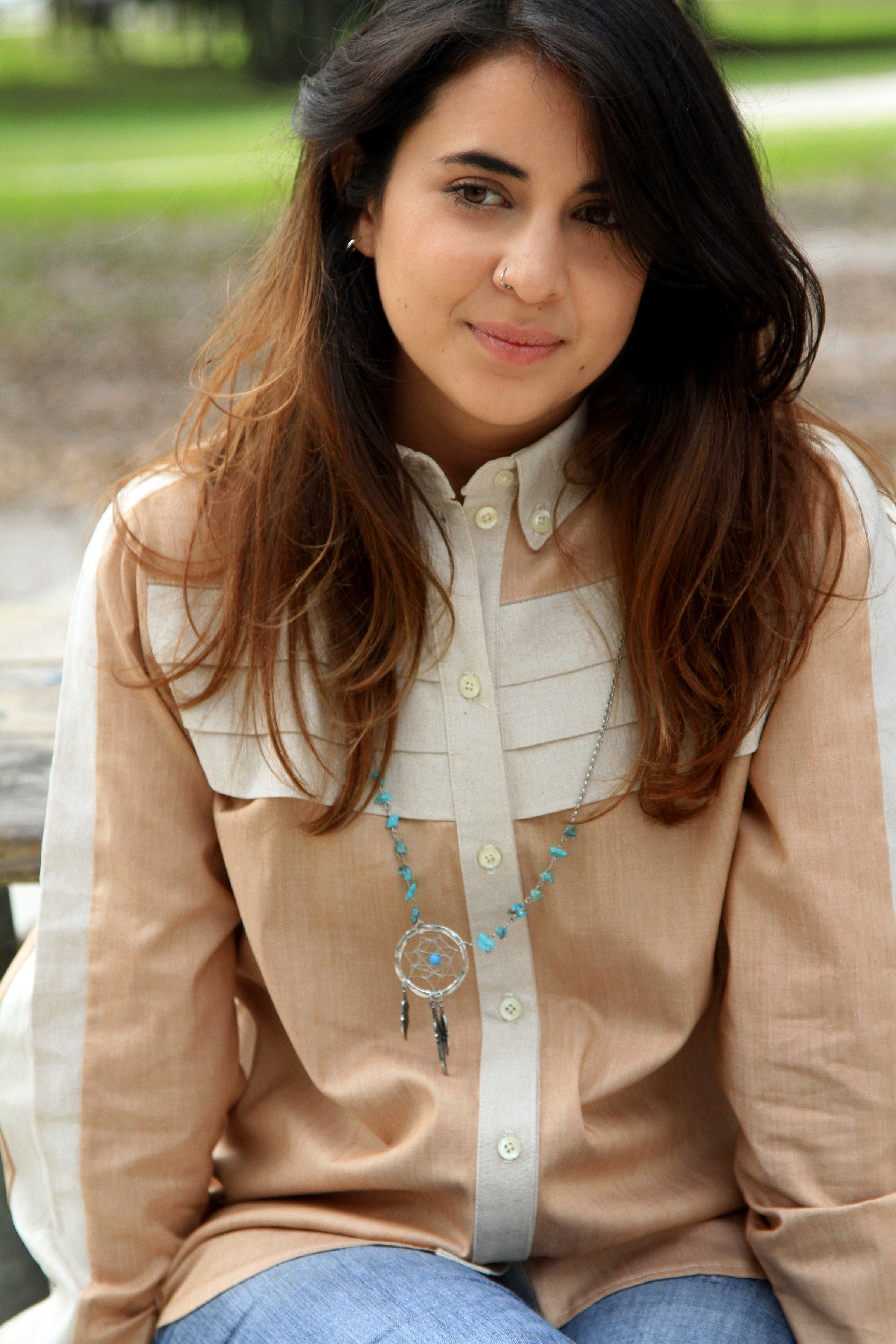 Here is another great version of a button up shirt with more details you can choose add. It has two great options to choose from, a loose-fitting button-up shirt or a knee-length shirt dress. The front pleat detail is super structured yet playful and the three-piece sleeve with the middle piece that continues up until the collar is perfect for using two different fabrics. We used our AGF Linen mixed with “Adobe Clay” Solid sooth denim! They make such a dreamy combo!