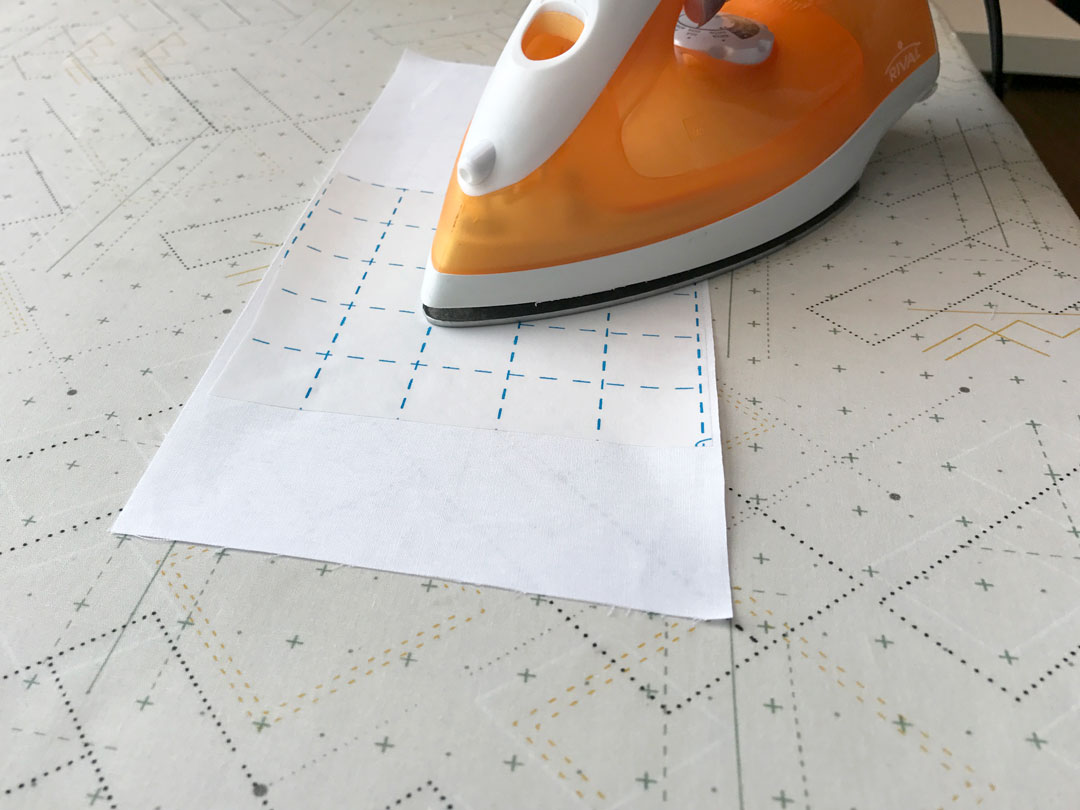 Peel the paper off all the strips except from one of the shorter ones and place the top of the pillow over the backing. Iron the edges to make sure the sides stick together. (The side you didn’t peel off will leave a little hole to insert the batting.)
