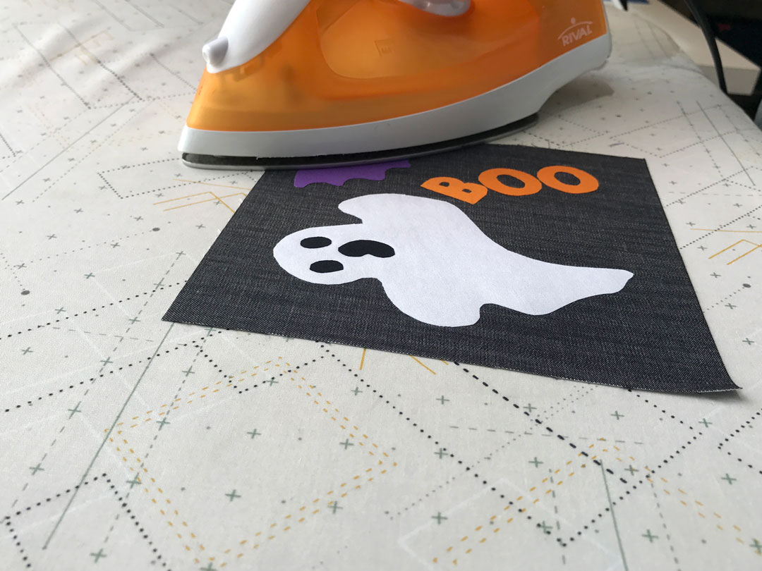 Cut a piece of fabric about the size of the design you’ll be making from the template. Place a piece of Steam-A-Seam onto the fabric and press.