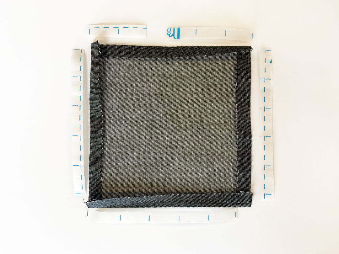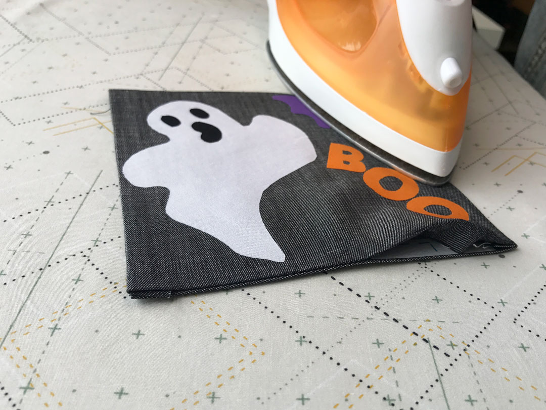 Cut out three 5" strips of Steam-A-Seam and place over folded seams and press. Cut two 2.5” strips for the fourth side and press. (Note: Use 7” strips if you’re making the other pillow designs.)