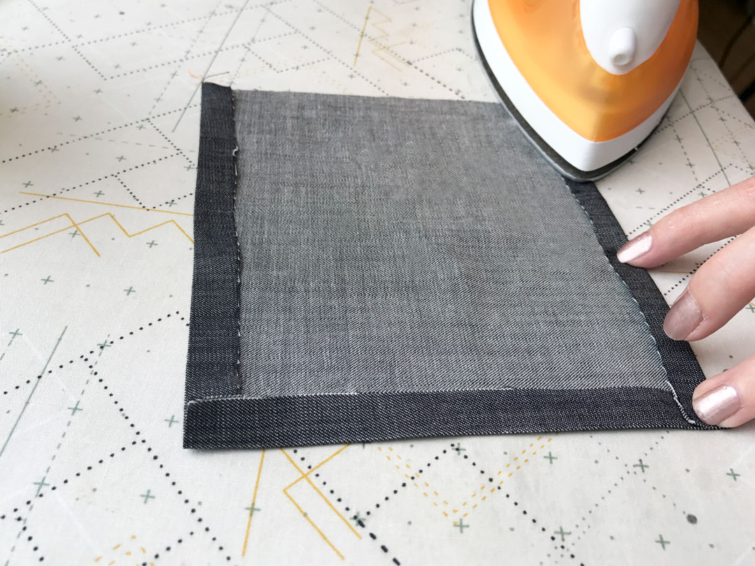 Flip the front of your pillow top and fold a ¼” seam around the square. Iron it to keep it in place. Repeat this step with the backing of your pillow.