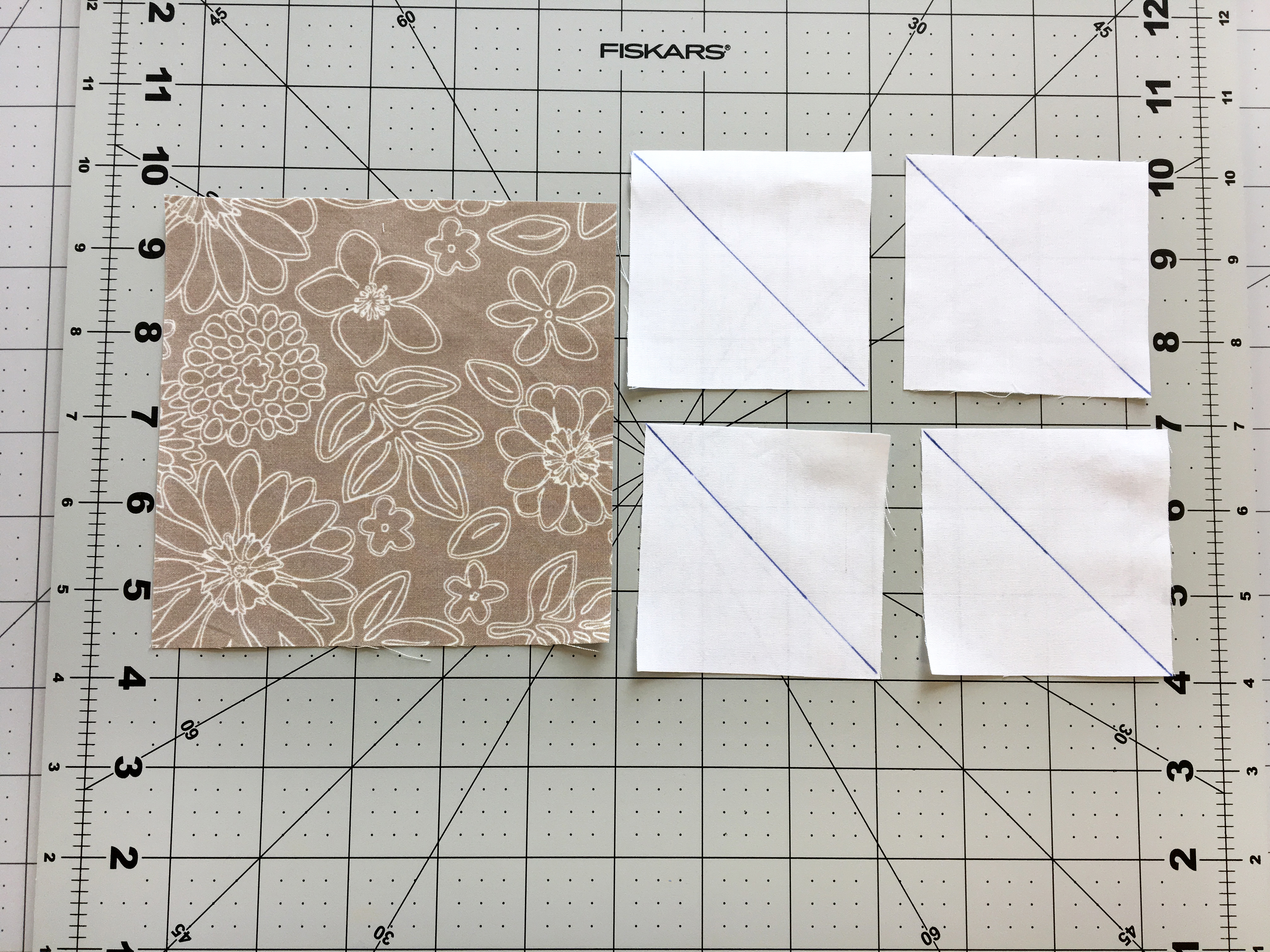 Take a 5 1/4” x 5 1/4” square from Fabric A and four (4) 2 7/8” x 2 7/8” squares from Fabric H. These are the pieces you will need to create four flying geese units.