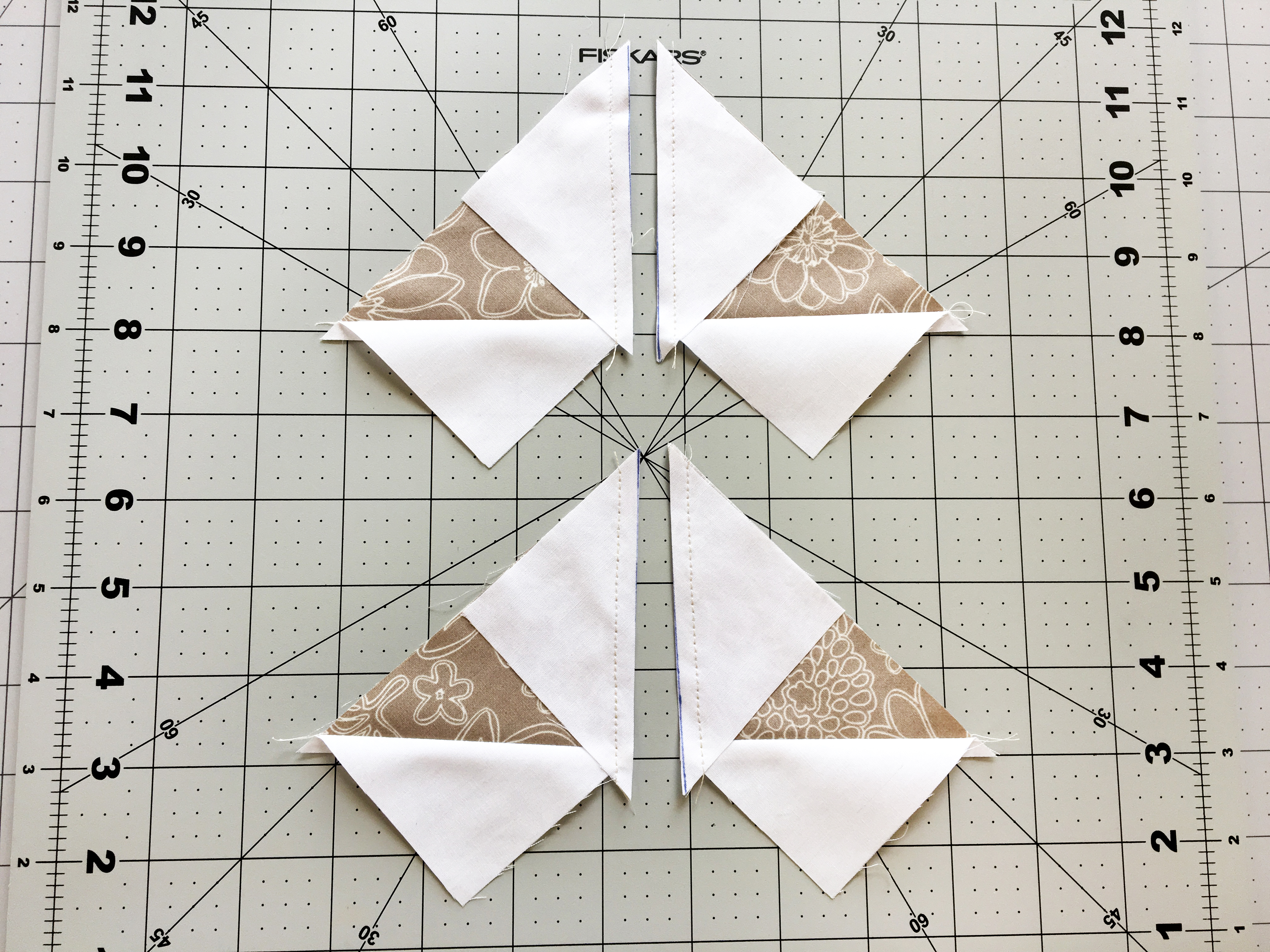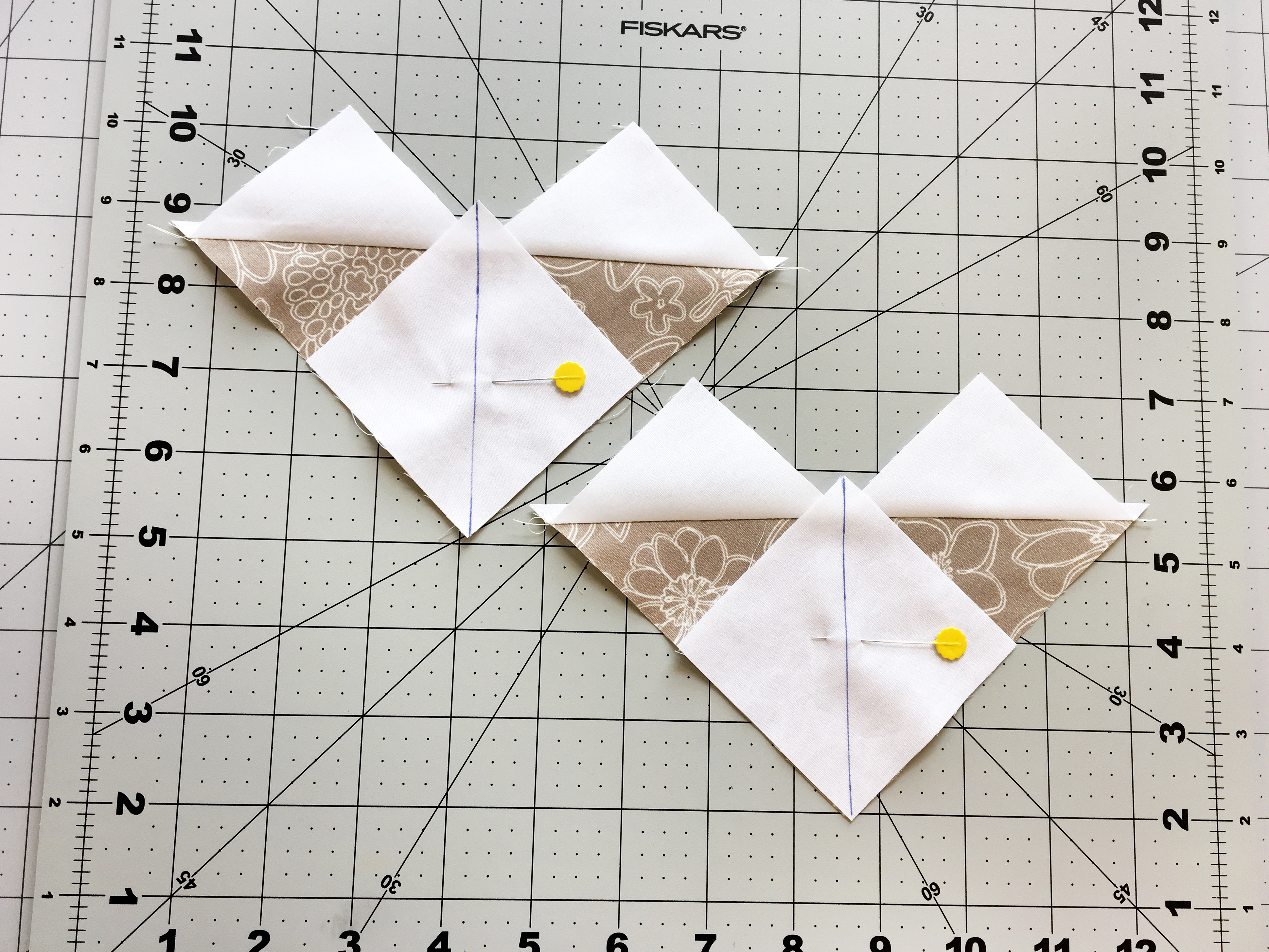 Place two (2) 2 7/8” x 2 7/8” squares at each corner of your 5 1/4” x 5 1/4” square from Fabric A. Make sure right sides are together and the diagonal lines match up to make a straight line.