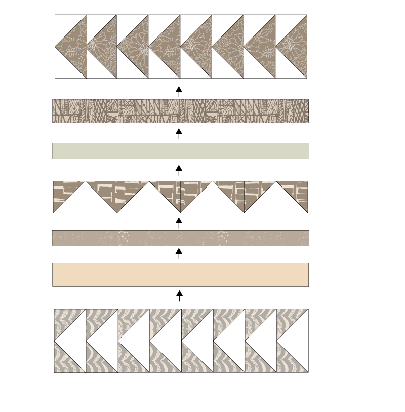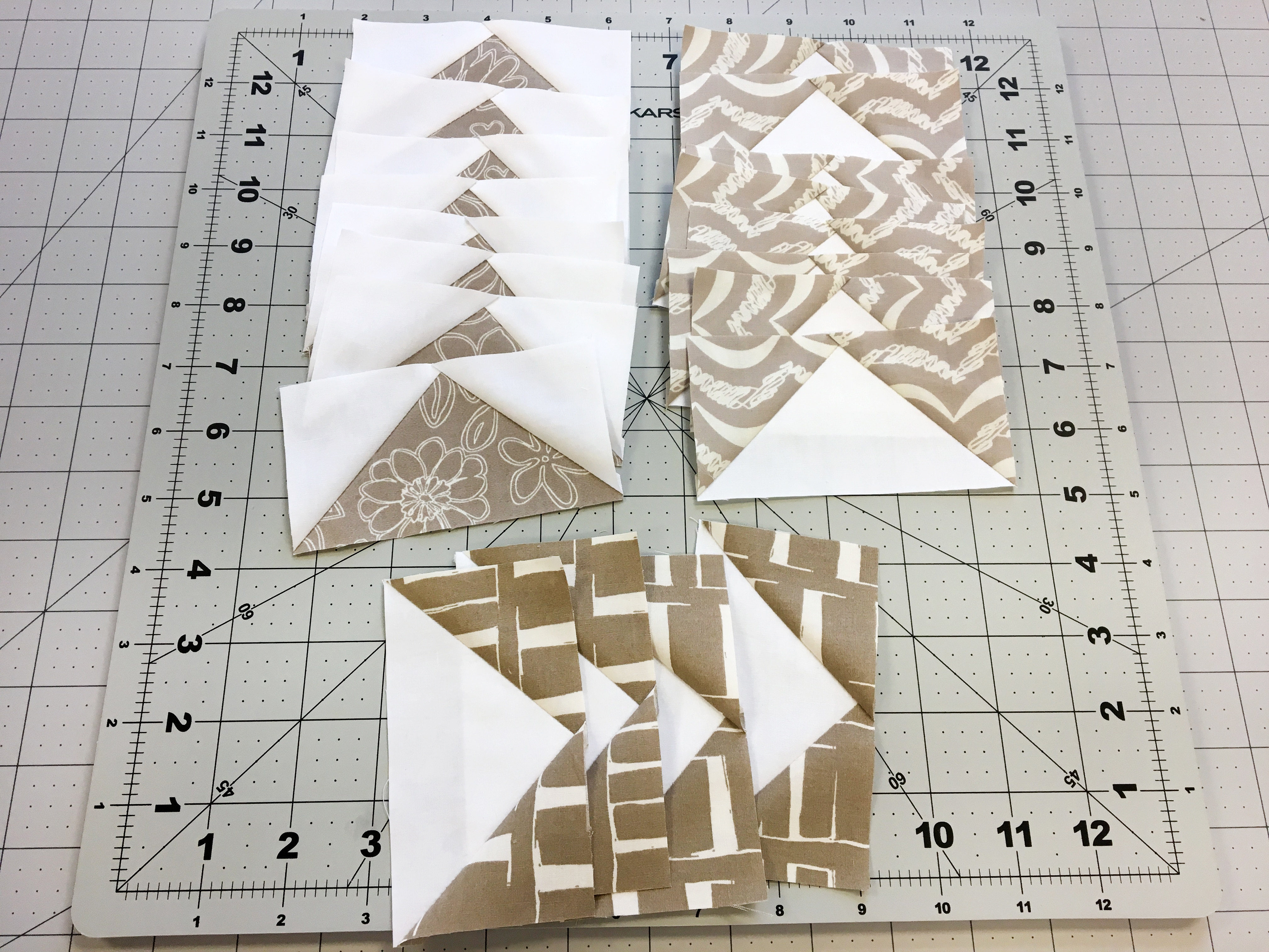 Press open and trim your flying geese to 2 1/2" x 4 1/2". Repeat this process with your remaining 5 1/4" squares and 2 7/8" squares to get eight (8) A/H, eight (8) C/H, and four (4) H/B flying geese! Sew all your flying geese together following the block design.