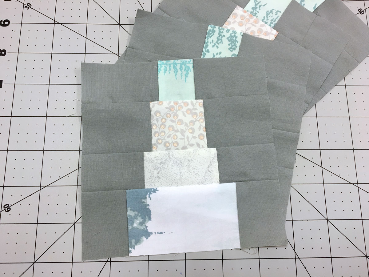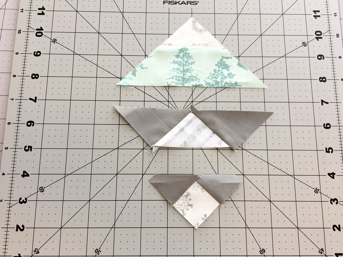 Lining up the midpoint of all three pieces sew together to form a block. Trim block to a 4" square.