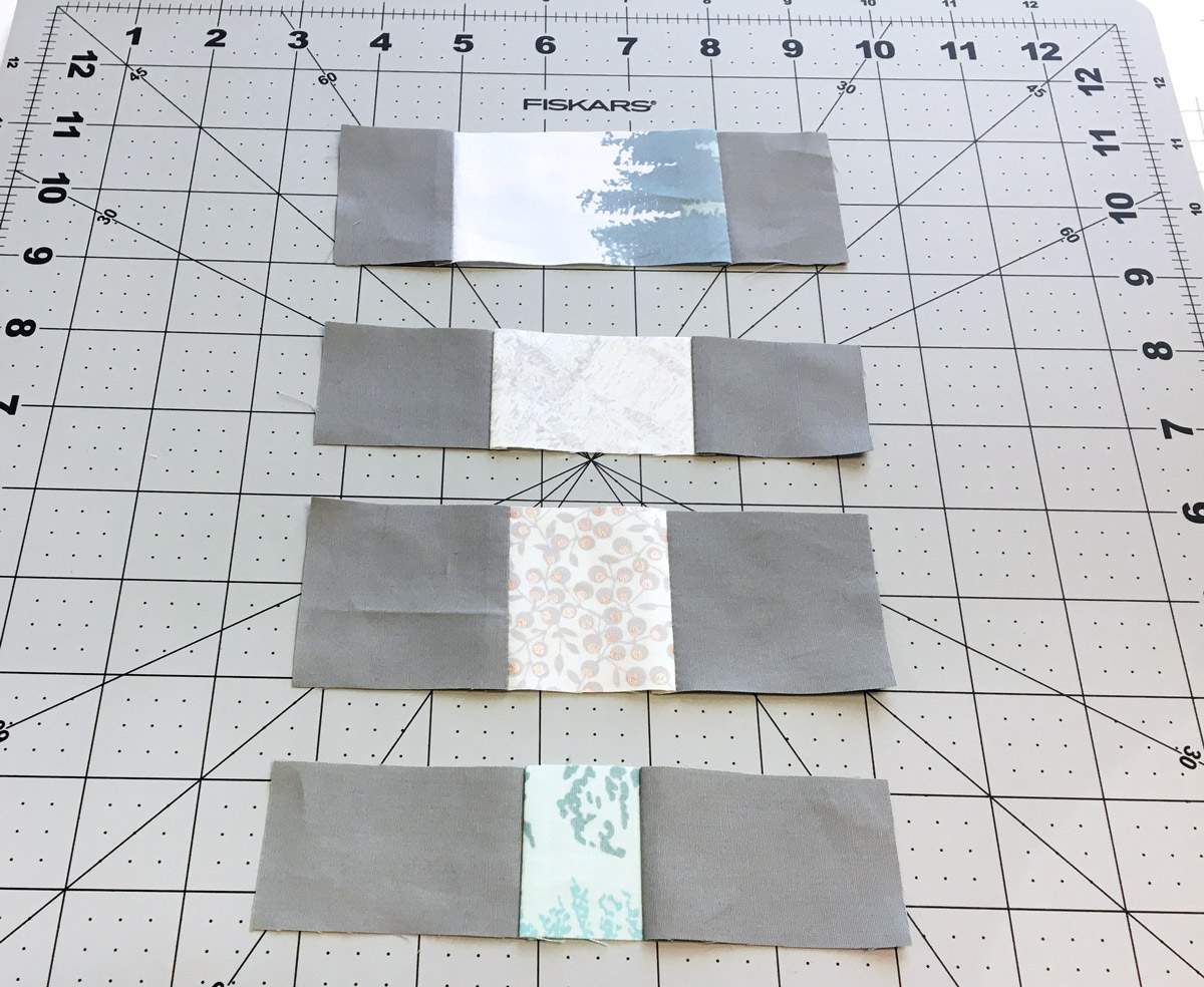 Set 4: 1 1/2" x 9" strip from Fabric H > 3 1/2" x 9" strip from Fabric C > 1 1/2" x 9" strip from Fabric H