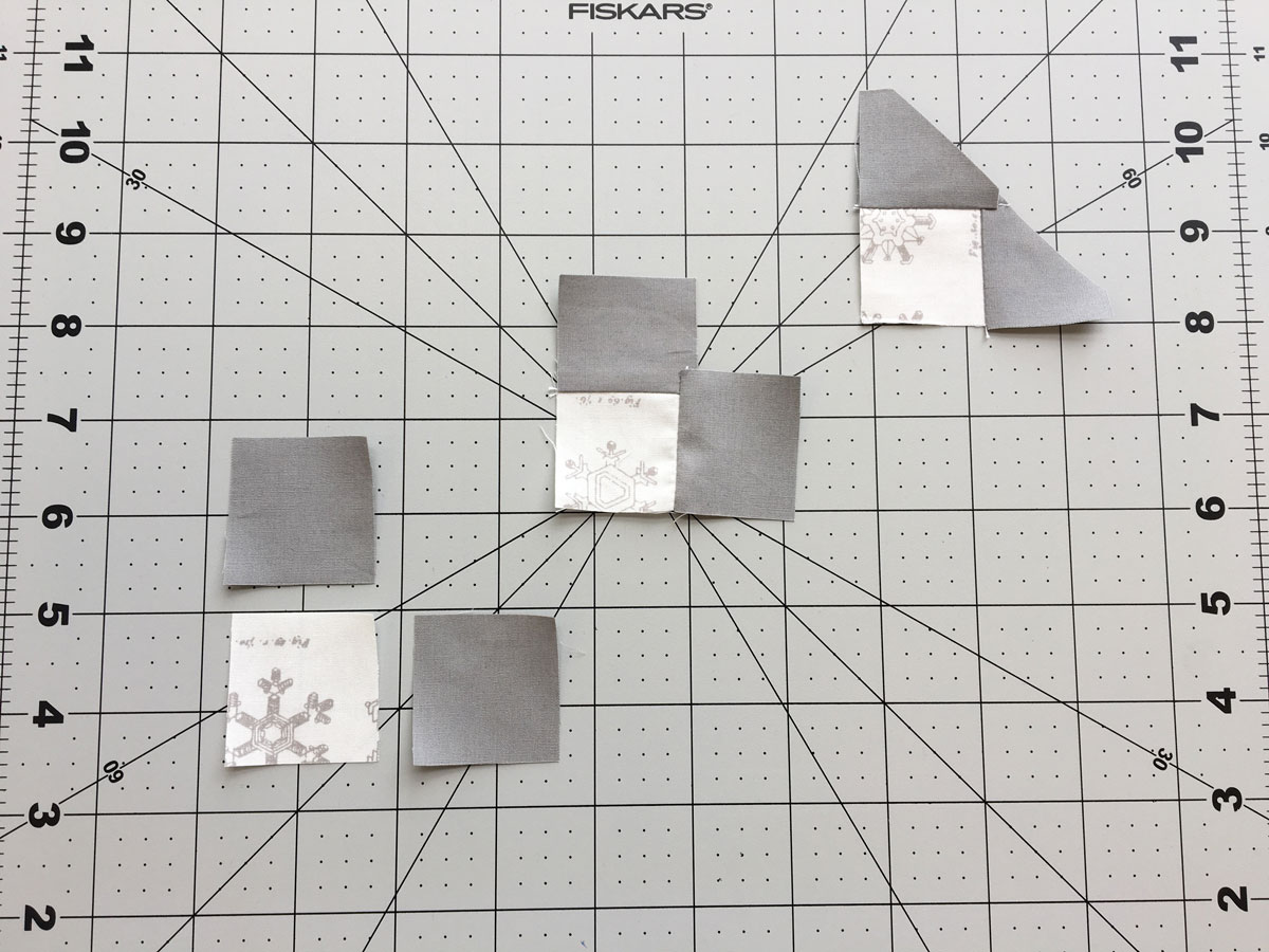 Sew two 1 1/2' square from Fabric H to the top and side of a 1 1/2" square from Fabric E. Trim your piece on the diagonal leaving 1/4" seam allowance.